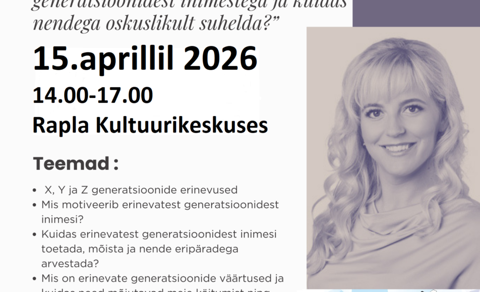 15.aprillil algusega 13.00 Rapla Kultuurikeskuse kinosaalisAjakava12.45-13.00 kogunemine13.00-14.30 I sessioon14.30-14.45 sirutus, ergutus ja energiapaus14.45-16.00 II sessioon